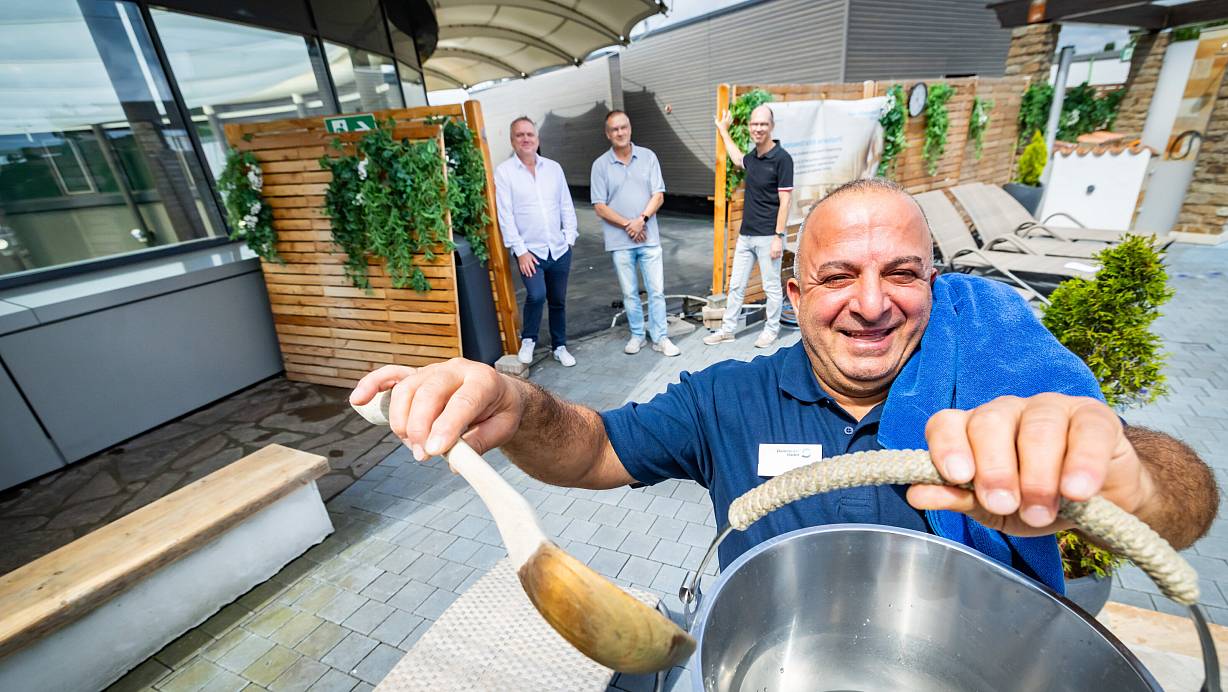Im Sommer informierten BBF-Geschäftsführer Marcus Lufen (hinten, v. l.) sowie Tom Hansman und Hans-Jürgen Stern von den BBF gemeinsam mit Saunameister Recep Selcik über das neue Angebot im Ishara. Durch die höheren Kapazitäten soll auch der zukünftige Wegfall der Sauna in Heepen kompensiert werden. | © Sarah Jonek