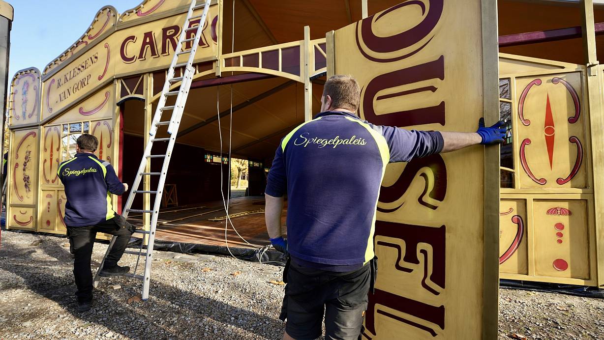 Mitarbeiter des belgischen Traditionsunternehmens „Het Spiegelpaleis“ errichten das historische Spiegelzelt im Ravensberger Park in Bielefeld. | © Peter Unger