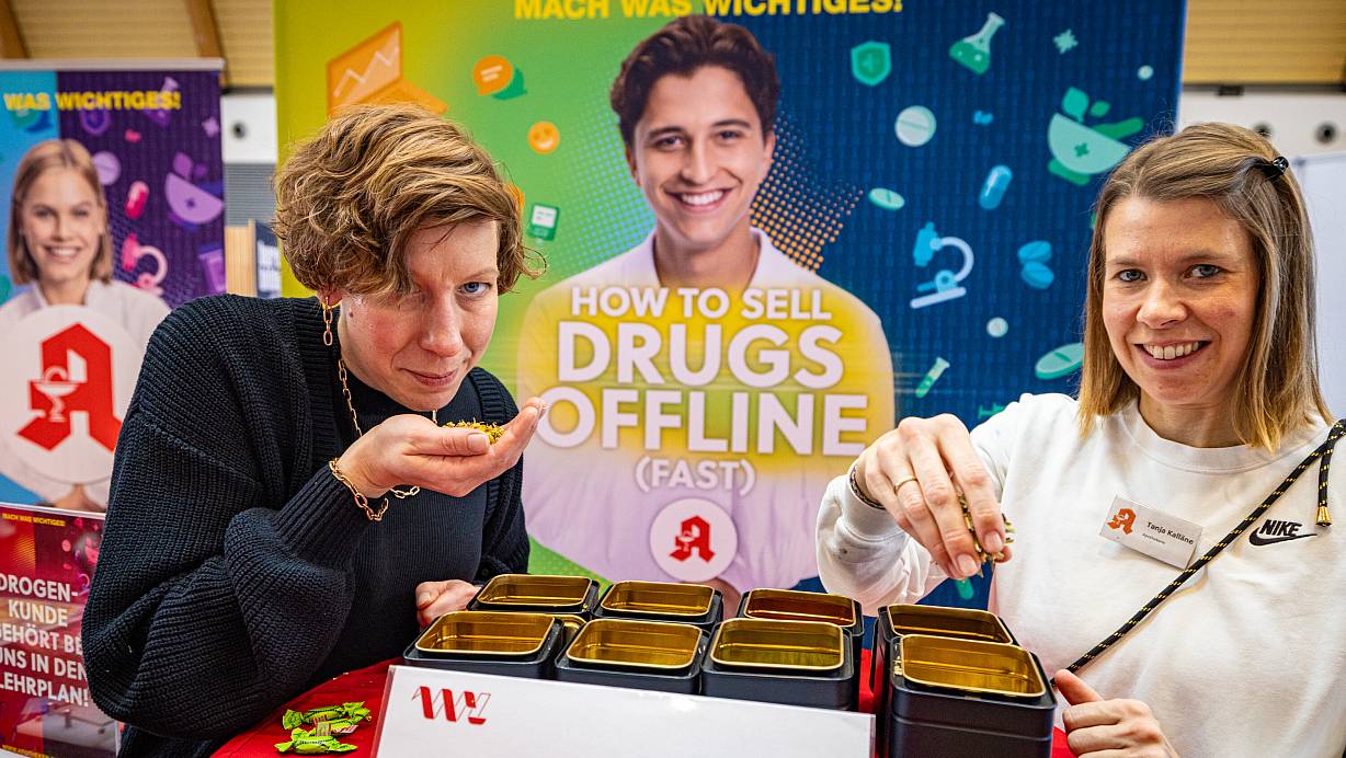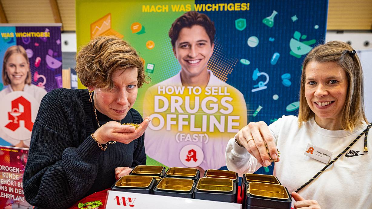 Schnuppern am Stand der Apothekerkammer an getrockneten pflanzlichen Substanzen: Die Pharmazeutisch-technische Assistentin Marina Henkenjohann (l.) hält duftende Kamillenblüten in der Hand, Apothekerin Tanja Kalläne hält Nelken. Im Hintergrund ein Werbeplakat für die Arbeit in Apotheken: Wie man "Drogen" verkauft. | © Mueller