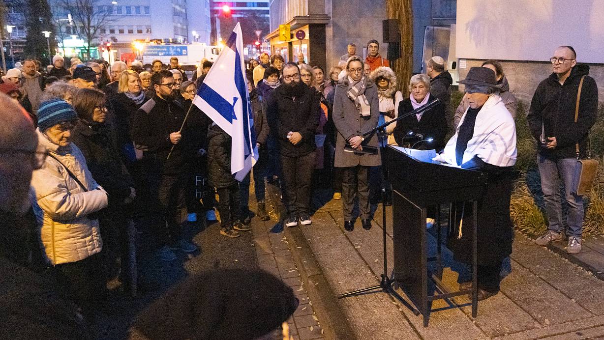 Paul Yuval Adam (re.), spricht die Gebete, links neben ihm Irith Michelsohn (beide Jüdische Kultusgemeinde) und Oberbürgermeisterin Christiana Bauer (4.v.re.). Viele Menschen versammelten sich zum Gedenken am Ort der ehemaligen Synagoge. Im Hintergrund: Ein schwerer Lkw des Umweltbetriebes sichert die Turnerstraße ab. | © Mike-Dennis Mueller
