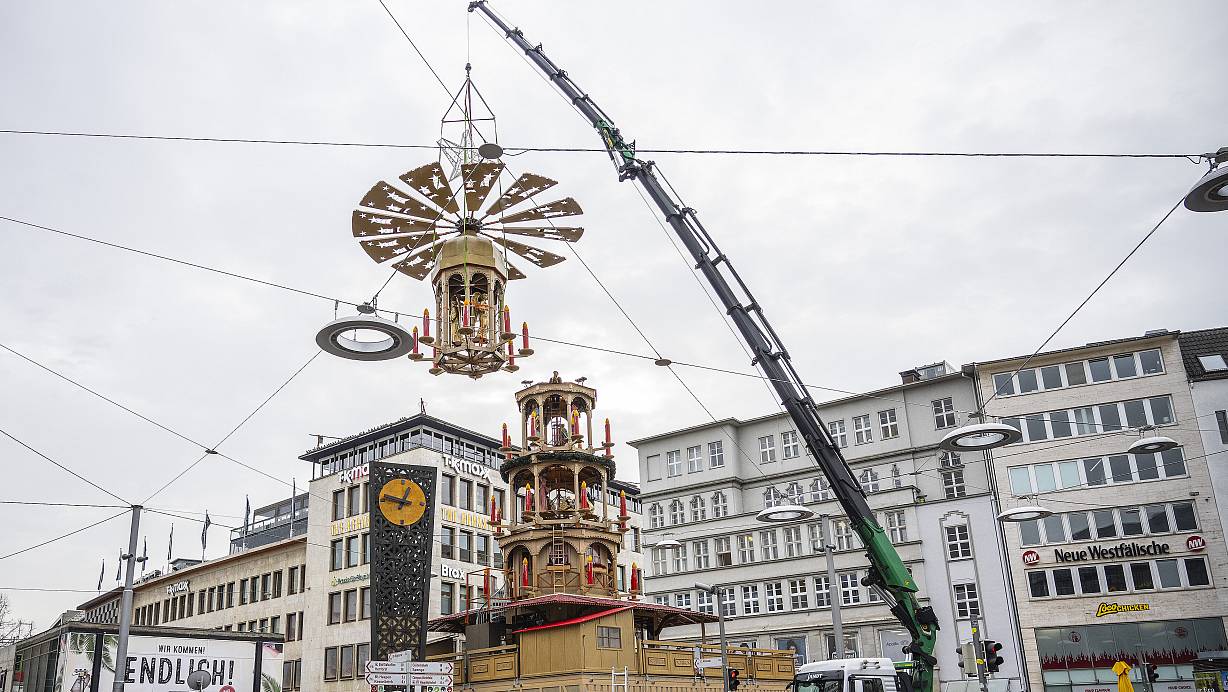 Die 23,52 Meter hohe Weihnachtspyramide ist ein Highlight des Bielefelder Weihnachtsmarkts. Nun ist sie zurück auf dem Jahnplatz. So läuft der Aufbau.