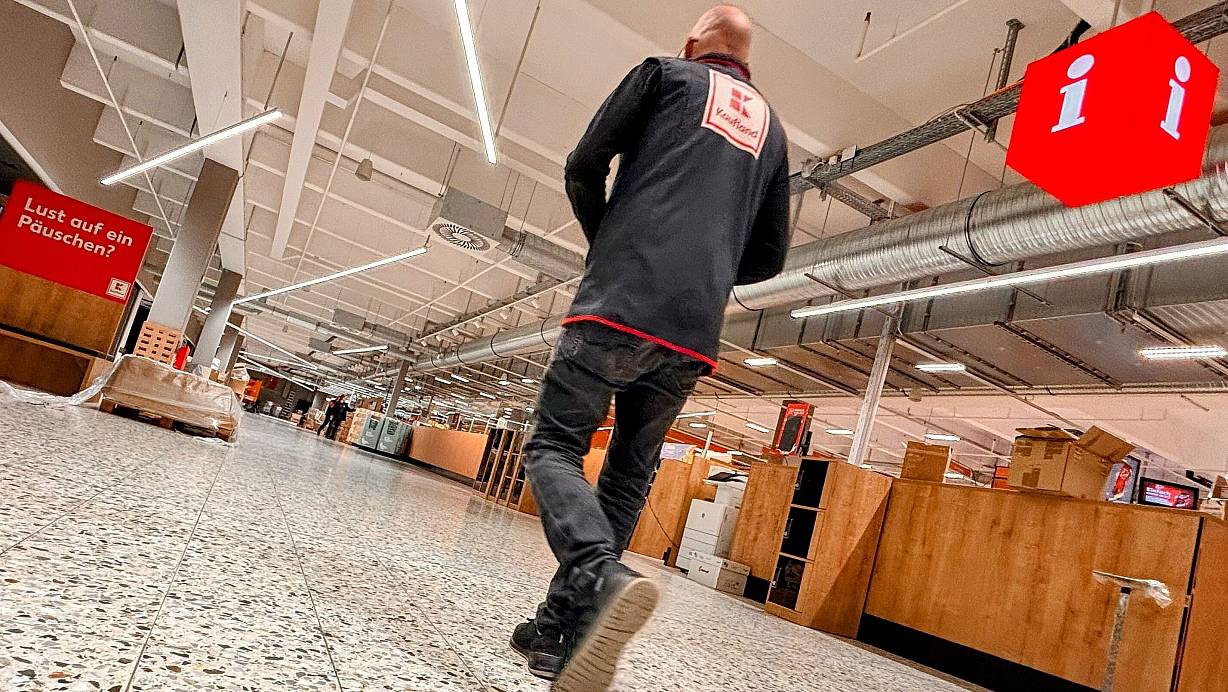 Lust auf ein Päuschen? Sicher, aber nicht jetzt: Ein Kaufland-Mitarbeiter läuft durch den Eingangsbereich der Filiale an der Teutoburger Straße. Vieles sieht schon fertig aus, die meisten Regale sind auch schon gefüllt. Doch fertig ist beileibe noch nicht alles. Foto: Eike J. Horstmann | © Eike J. Horstmann