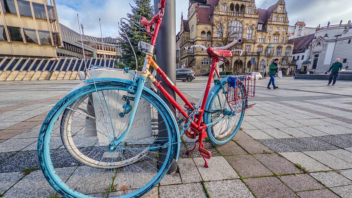 Die beiden Fahrräder stehen seit mehr als fünf Jahren angekettet gegenüber dem Alten und dem Neuen Rathaus. Doch verlassene und vergessene Schrotträder sind sie nicht - im Gegenteil. | © Andreas Zobe