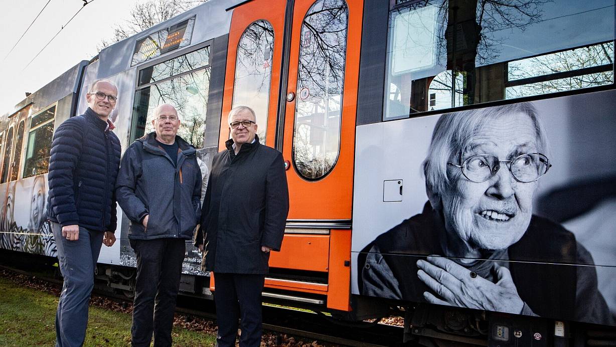 Martin Uekmann (v.l.), Veit Mette und Pastor Ulrich Pohl freuen sich über die neugestaltete Bethel-Bahn in Bielefeld. | © Matthias Cremer / v. Bodelschwinghsche Stiftungen Bethel