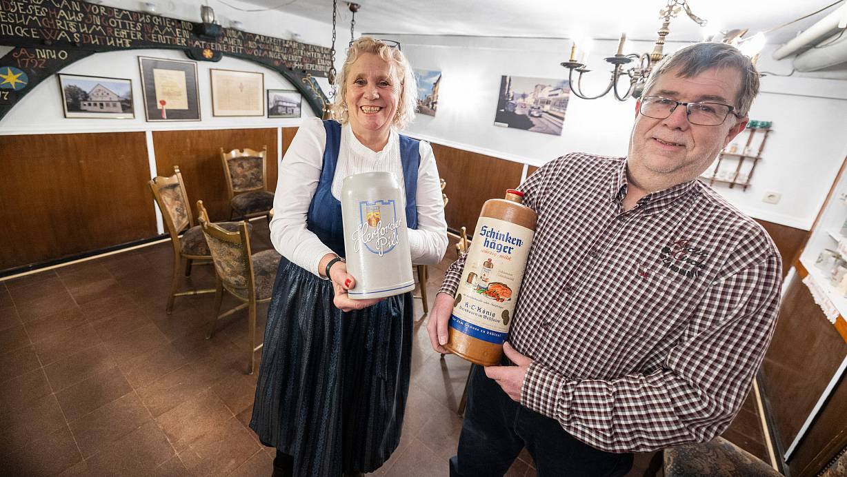 Rosemarie Flöthmann, Heimatpflegerin, und Detlef Kropp, Beisitzer im Vorstand, mit historischen Krügen aus Ostwestfalen-Lippe. | © Oliver Krato
