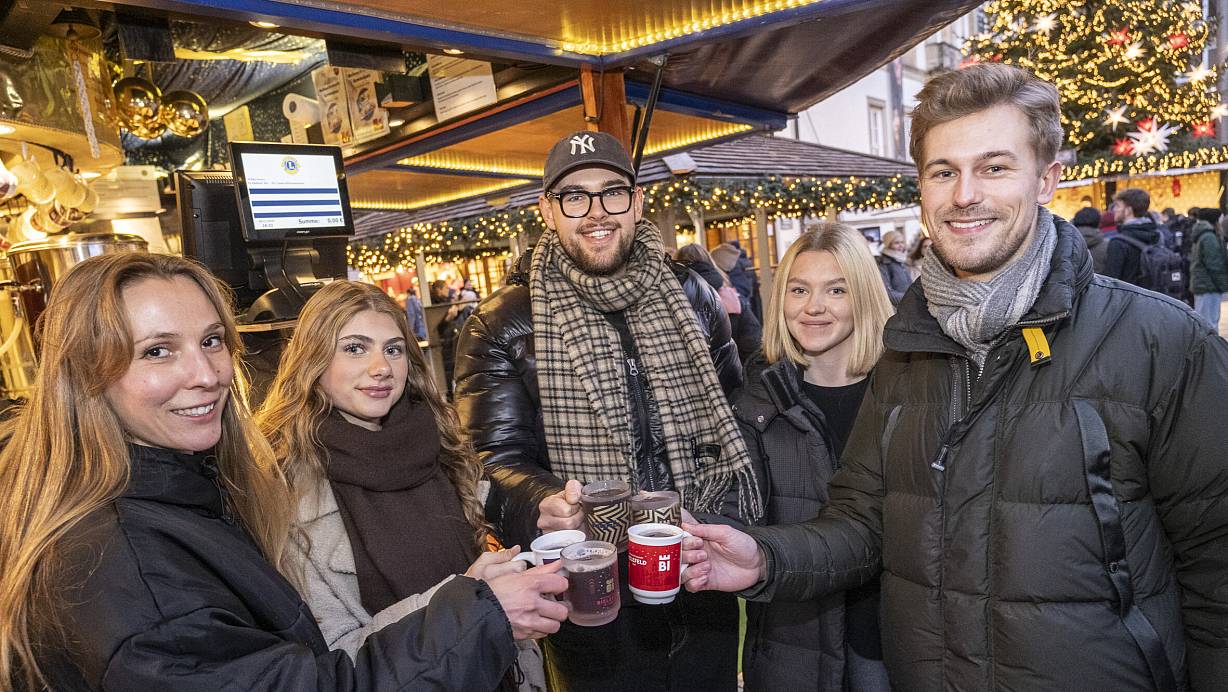 Verena Freiberg (v.l.), Jana Billing, Philipp Köster, Maja Niemeyer und Tom Steinert beim Getränketest auf Weihnachtsmarkt. | © Jörg Dieckmann