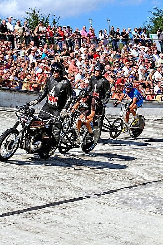 "Bei den Ausdauerrennen, auch Steherrennen genannt, werden Geschwindigkeiten von bis zu 80 Stundenkilometern erreicht, bei Sprints, auch als Fliegerrennen bezeichnet, zwischen 70 und 80 Stundenkilometern", zeigt sich Anne Herden-Hubertus beeindruckt. Die Mitarbeiterin von Landeskonservator Markus Harzenetter hatte die Bahn vor einigen Monaten persönlich in Augenschein genommen.