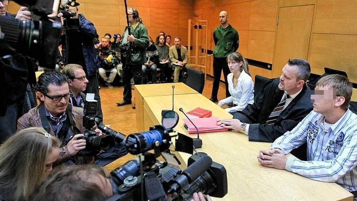 Der Angeklagte Fabian K. (rechts) blickt, zumindest äußerlich, ungerührt in die Objektive der Kameras. Neben ihm sein Verteidiger Andreas Chlosta sowie eine Rechtsreferendarin. | © FOTOS: WOLFGANG RUDOLF