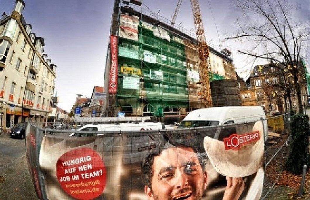 Ein neuer Pächter für die Gastronomie kam ins Spiel. Wolfgang Dewitz, spezialisiert auf Systemgastronomie, will jetzt in diesen Räumen als Franchisenehmer eine Filiale der Kette L'Osteria eröffnen. Als Einzugstermin war der vergangene September vereinbart. Zu diesem Zeitpunkt sollte laut Behrendt das Dach über dem nun fünfgeschossigen Haus fertiggestellt sein.
