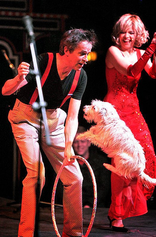 Florin lässt Hund Cato über einen Reifen springen. Das Tier hatte sich vorher ein wenig vor dem Kunststück geziert. Zur Freude der Zuschauer. | © FOTOS: ANDREAS FRÜCHT
