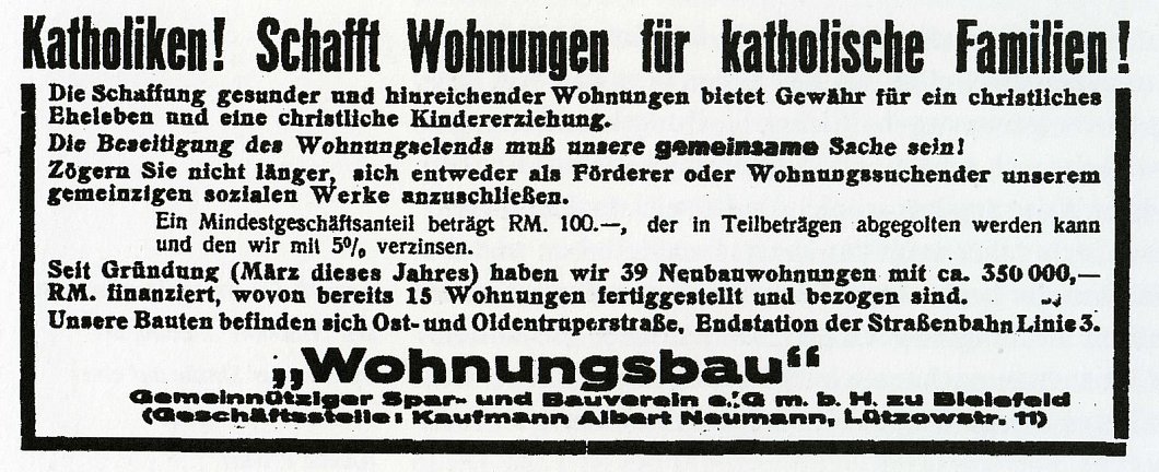 Am 10. März 1929 erschien im Turm, der damaligen katholischen Tageszeitung in Bielefeld, ein Aufruf zur Gründungsversammlung einer katholischen Baugenossenschaft, die der anhaltenden Wohnungsnot entgegentreten sollte. Zunächst wurden 39 Wohnungen realisiert. Im ersten Bauabschnitt entstanden ein repräsentatives viergeschossiges Eckhaus in schönen, modernen Linien mit 15 Wohnungen, die den Anforderungen neuzeitlicher Wohnkultur, wie Toiletten, entsprach.