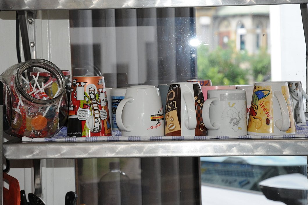 Stammkunden haben ihre eigenen Kaffetassen - aufgereiht im Regal