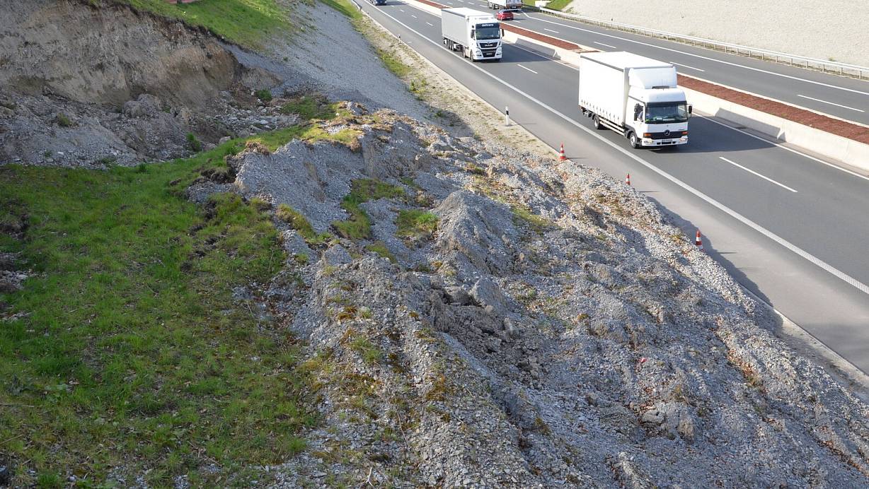 Bis zum Fahrbahnrand liegt das abgesackte Material. Die Autobahn GmbH arbeitet an der Sanierung. Wie sicher ist der Rest der steilen Böschung in diesem Bereich?