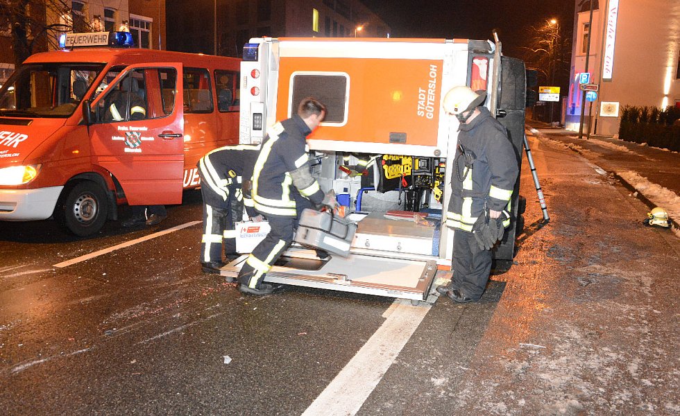 Gütersloh. Ein Rettungswagen der Feuerwehr Gütersloh ist am Freitagabend bei einer Blaulichtfahrt mit einem Taxi zusammengestoßen und dabei auf die Seite gekippt. Der Taxifahrer sowie eine Beifahrerin im Rettungswagen wurden dabei verletzt. Es entstand ein Sachschaden von rund 200.000 Euro.