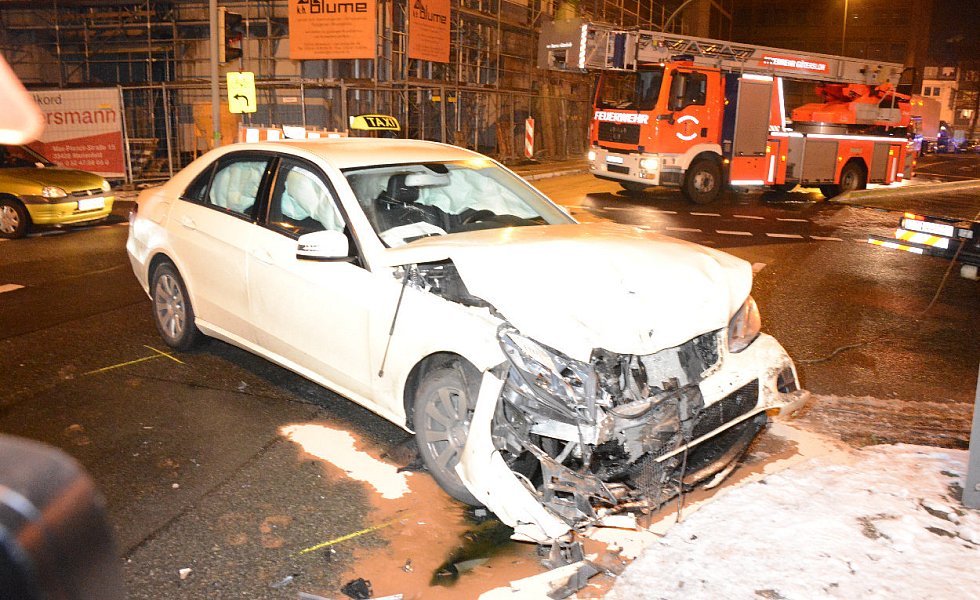 Gegen 22 Uhr war der Rettungswagen auf der linken Fahrspur der zweispurigen Friedrich- Ebert-Straße in Richtung Kaiserstraße unterwegs. Auf der Kreuzung zur Eickhoffstraße kommt es zum Zusammenstoß mit einem Taxi, das auf der Eickhoffstraße in Richtung Berliner Straße auf dem rechten von zwei Fahrstreifen unterwegs war.