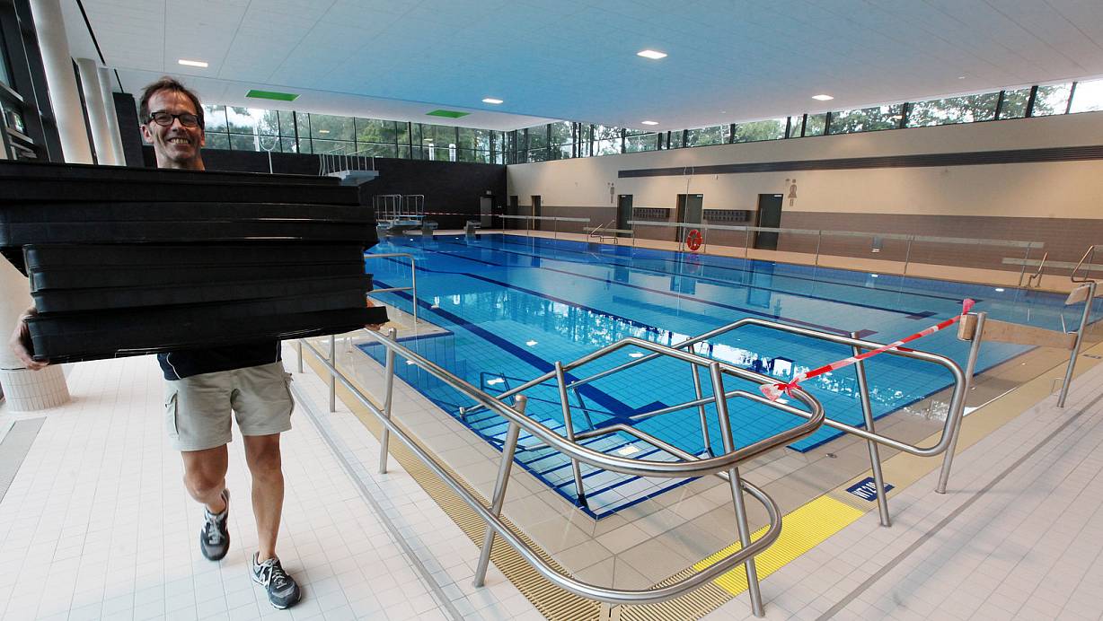 Letzte Handgriffe: Schwimmmeister Heinz Hermann Engelmeier trägt Regale für die Umkleidekabinen in das Hallenbad. Damit kein Handwerker versehentlich ins Wasser fällt, ist das Schwimmbecken mit Holzlatten und Flatterband abgesperrt. | © Patrick Menzel