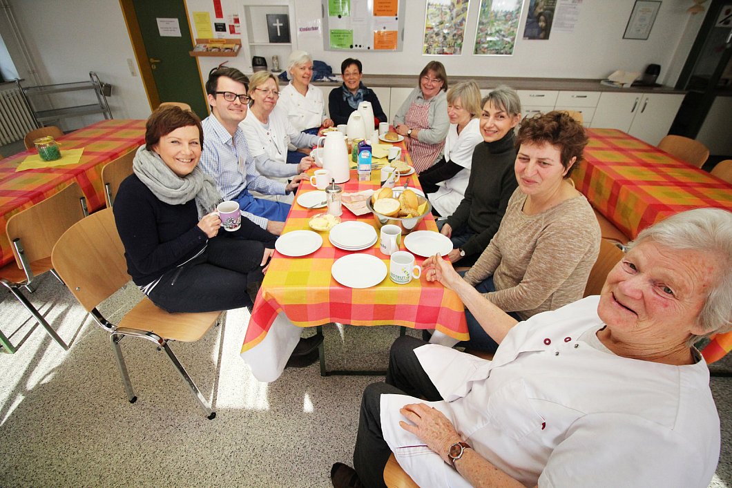 Zeit zum Verschnaufen. Alle Mitarbeiterinnen und Mitarbeiter aus der Schicht treffen sich zu einem gemeinsamen Frühstück. Was hier verzehrt wird, bringen sie selbst mit. Die gespendeten Lebensmittel sind tabu. Da ist Inge Rehbein rigoros. "Es gab bei uns schon Fälle, in denen sich jemand in den Regalen bedienen wollte. Doch die Lebensmittel sind für die Bedürftigen, nicht für uns."