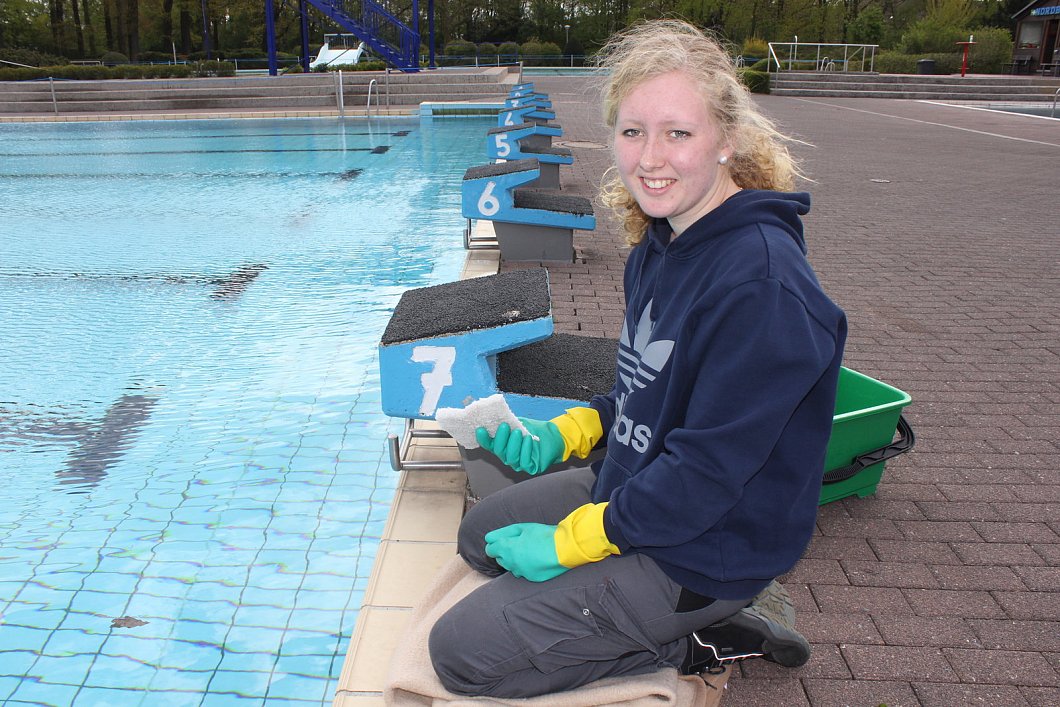 Seit drei Wochen richten auch die beiden Azubis Pia Rempe und René Callesen das Nordbad nach seinem Winterschlaf wieder her. Während Pia Rempe per Handarbeit den Beckenrand und Überläufe reinigt, steht Callesen mit einer kleinen Fernbedingung am Sprungbecken und steuert den gemächlichen Bodensauger. "Seit drei Stunden mache ich das jetzt schon", sagt Callesen, "aber dafür ist es am Ende auch gründlich."