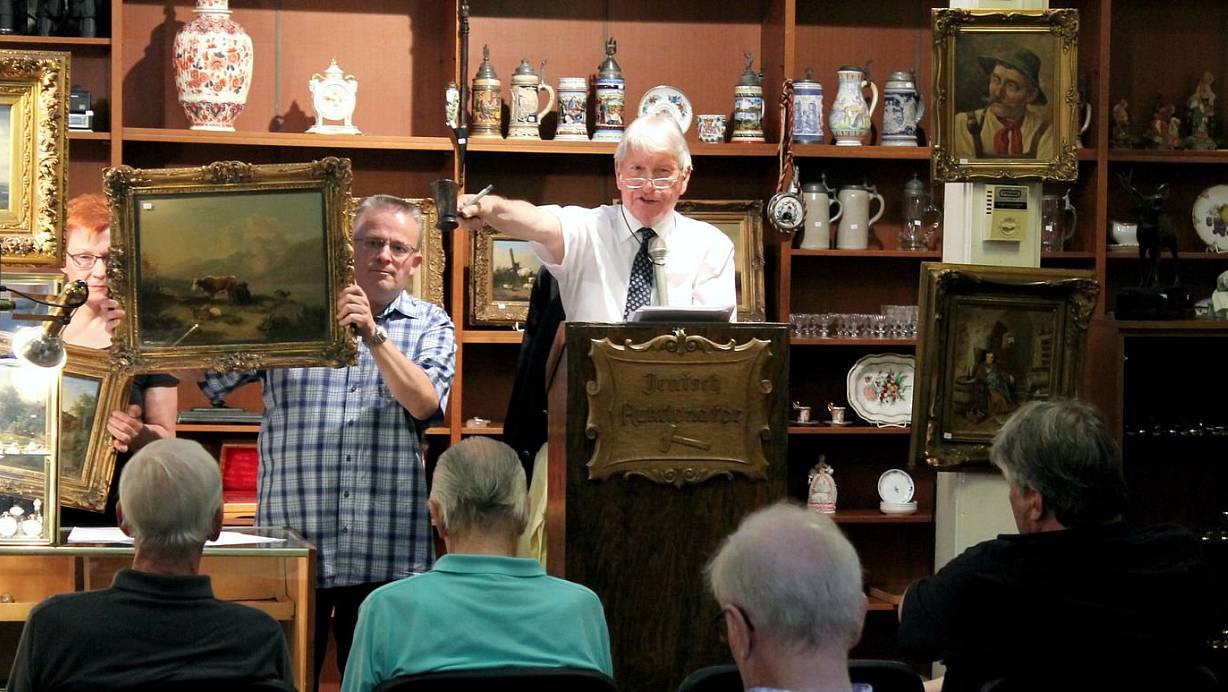 Fast pünktlich um 14.02 Uhr geht es los. Jentsch bittet um Ruhe und liest die obligatorischen Rechtsbelehrungen vor, um 14.08 kommt das erste Stück unter den Hammer. Bis auf gelegentlich eingestreute, scherzhafte Bemerkungen verschwendet der Versteigerungs-Veteran keine Zeit: "Interessiert sich überhaupt jemand für die Krüge? Gut, dann überspringen wir das und machen mit Nummer 68 weiter."