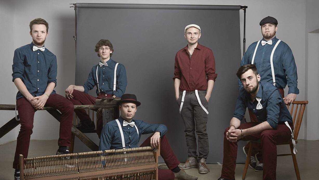 Zu Gast auf dem Dreiecksplatz: Jonas Buschsieweke und Band. Von links: Lukas Müller (Schlagzeug), Dimitri Thomas (Gitarre), Gregor Zimmermann (unten, Klavier), Buschsieweke (Gesang, Saxpophon), Daniel Krestovsky (sitzend, Bass) und Michael Tucker (Gitarre, Percussions, Tuba). | © Moritz Ortjohan