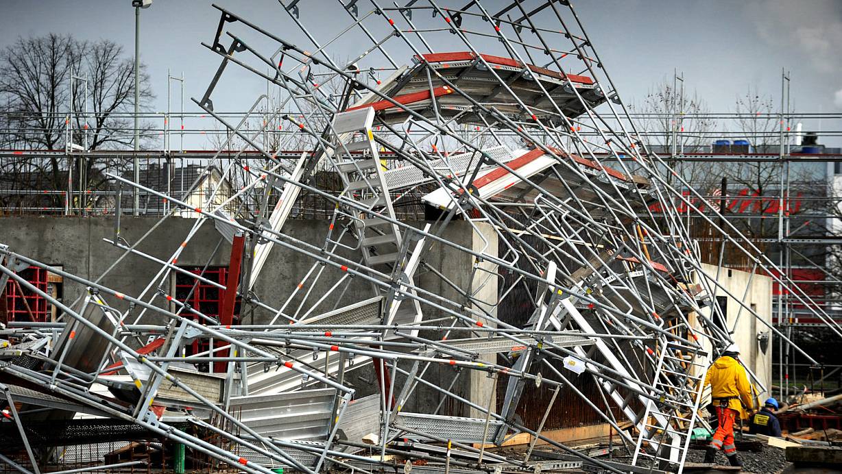 Umgeblasen: Das Baugerüst der neuen Feuer- und Rettungswache auf dem Marktplatz. Zum Glück kam niemand zu Schaden. | © Andreas Frücht