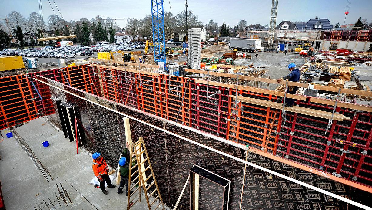 Baustelle: Mehr als 20 Arbeiter sind derzeit am Marktplatz mit dem Rohbau der neuen Feuer- und Rettungswache beschäftigt. Die Gliederung des Großvorhabens in vier Bauteile sorgt für einen reibungslosen Materialfluss und eine gute Taktung. Im Vordergrund: Bauteil 3, wo später der Rettungsdienst untergebracht wird. | © Andreas Frücht