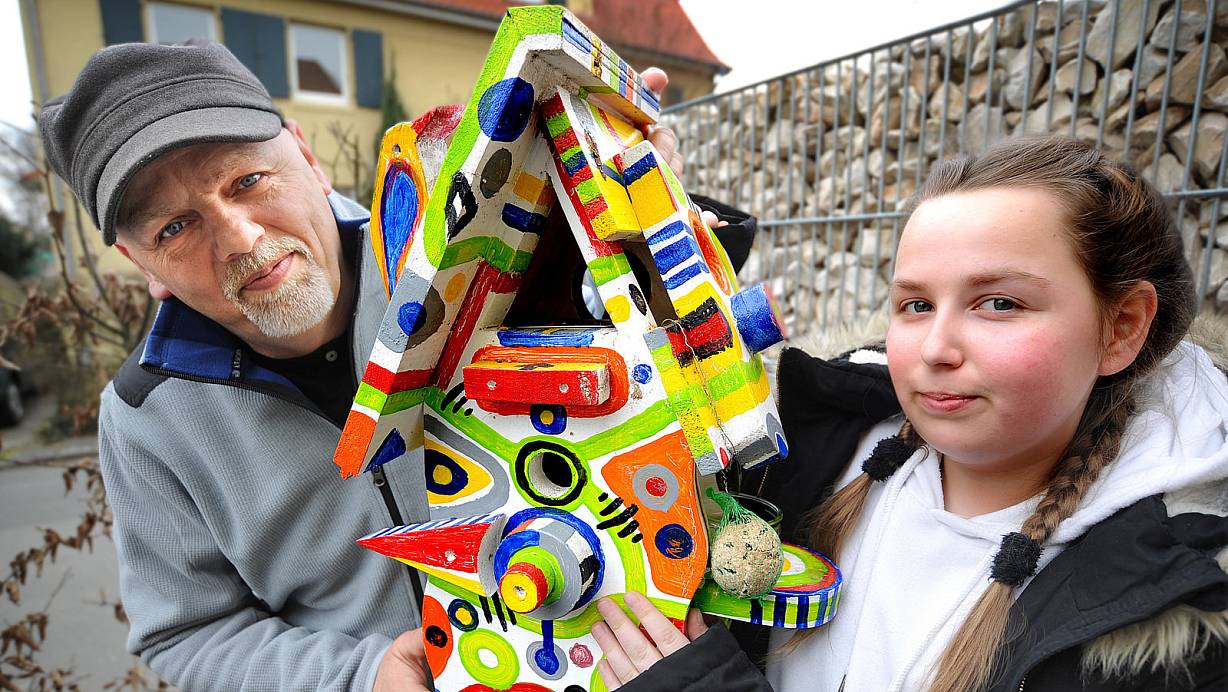 Farbenfrohe Vogel-Villa: Uwe Bettentrup hat gemeinsam mit seiner Tochter Jacquelin dieses Kunstwerk geschaffen und daraufhin die Vogelhaus-Challenge ins Leben gerufen. Aktuell zieht gerade eine Meise in das bunte Haus ein, berichtet er. | © Andreas Frücht
