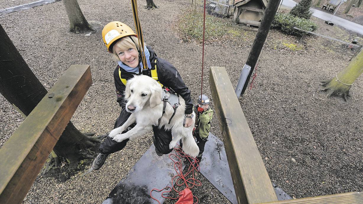 Gütersloh. Mabel ist nicht gerade erfreut. Das testweise durchgeführte, angegurtete Hochziehen auf drei Meter Höhe hat die dreijährige Golden Retriever-Dame noch völlig entspannt überstanden. Auf der Hängebrücke war sie sogar weit vor ihrem unter Höhenangst leidenden, sich behutsam vortastenden Frauchen Simone Isenberg (49) auf der anderen Seite.