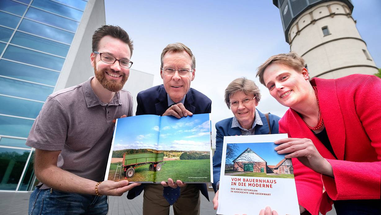Kreis Gütersloh. Gibt's nicht schon so einiges an Literatur über den Kreis Gütersloh? Einzelne Darstellungen über die 13 Städte und Gemeinden gewiss. Aber "das einzige mir bekannte, lieferbare Buch über die Gesamtheit des Kreises Gütersloh" ist für Buchhändlerin und Verlegerin Martina Bergmann "Vom Bauernhaus in die Moderne". Sie hat den Bildband mit dem Untertitel "Der Kreis Gütersloh in Geschichte und Gegenwart" kurzerhand selbst her-ausgebracht. Landrat Sven-Georg Adenauer nennt das Buch im Vorwort" eine Liebeserklärung an unseren Kreis Gütersloh."