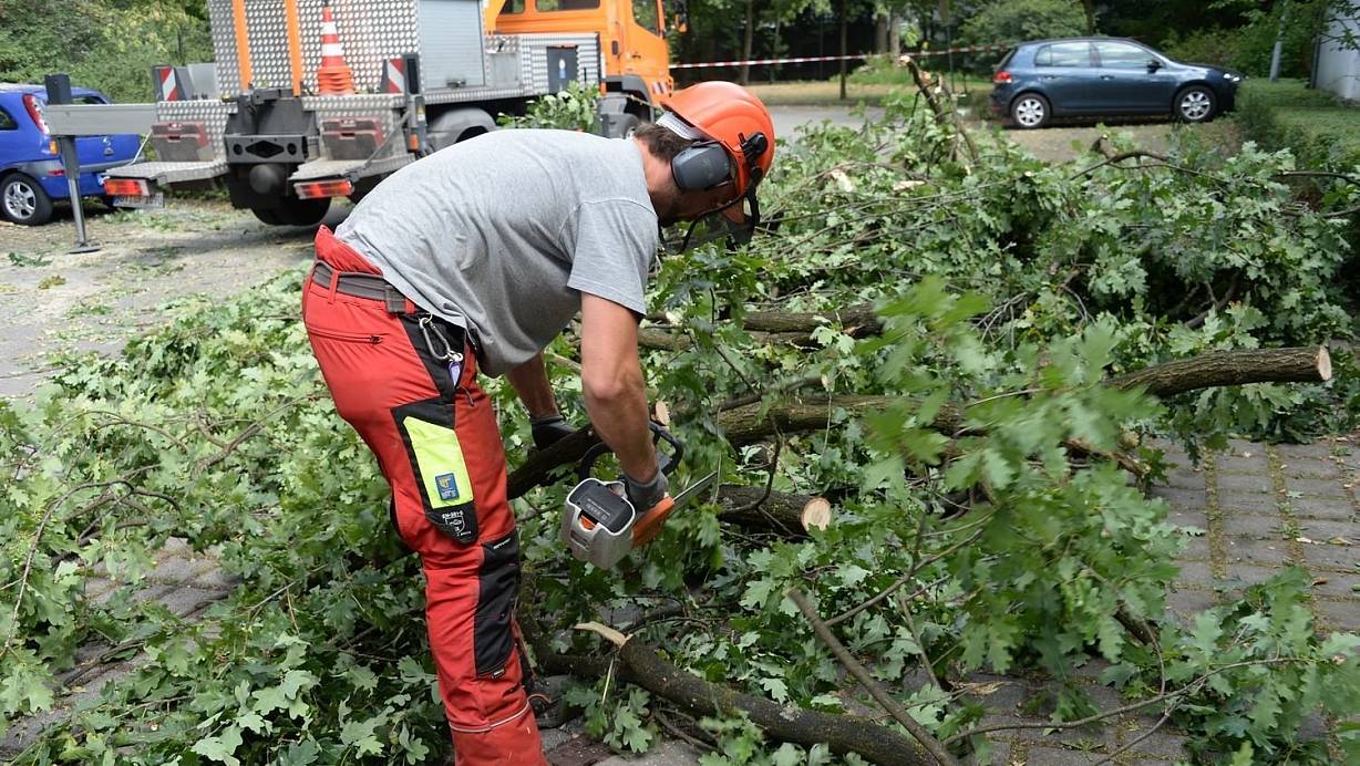 Mit Hilfe eines Hubsteigers sägte ein Mitarbeiter in mehreren Metern Höhe weitere Äste vom Baum ab, die direkt über dem Parkplatz hingen. Ein weiterer „fütterte" einen großen Häcksler mit den zersägten Holz, dass zu