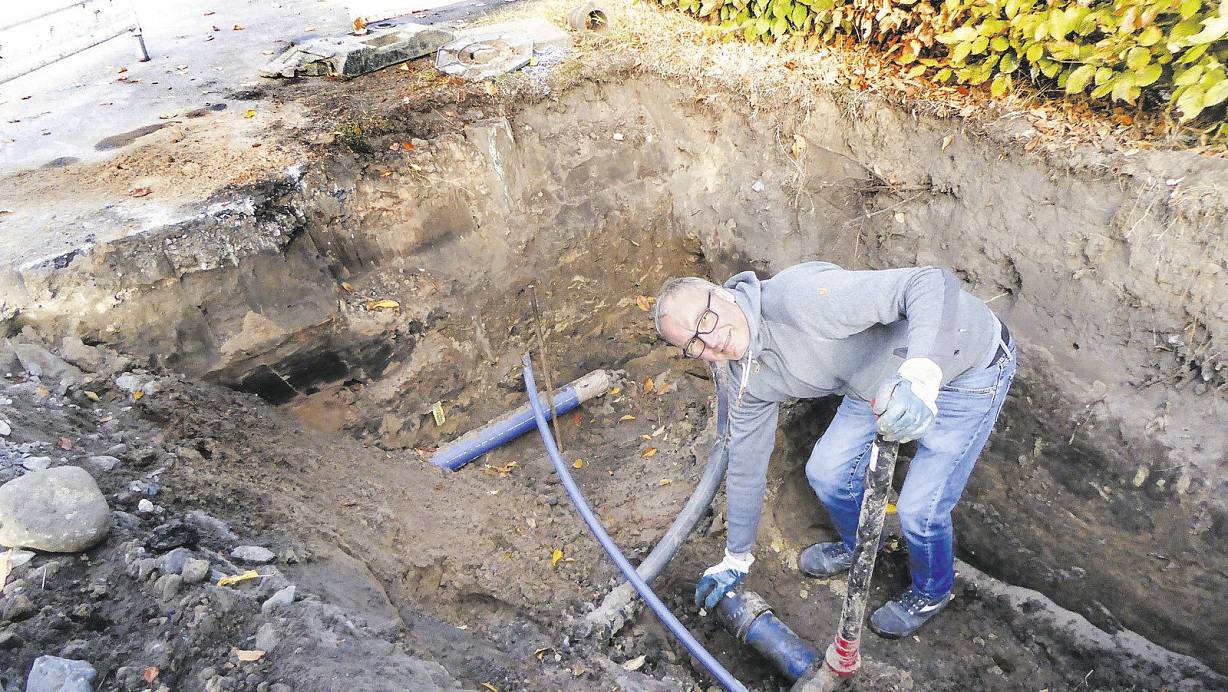 Geschäftsführer Rudolf Spörel von der Verler Spezialfirma Horsthemke hat die Hand an der Hauptleitung. Etwas weiter links ragt das Anschlussstück der neuen Wasserleitung aus der Erde. | © Rainer Holzkamp