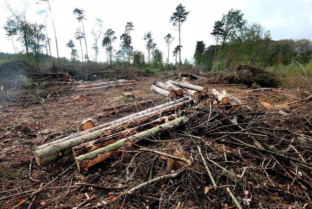 Ende Oktober, Ortstermin, Fürstlicher Wald Hambusch bei Rheda: Förster Michael Sommer und Forstdienstleister Hauke Moormann stehen vor einem etwa zwei Hektar großen Areal. Abgesägte Baumstämme liegen wild durcheinander, daneben stapelt sich meterhoch trockenes Nadelgeäst. „Die Fichte hier", sagt Sommer und zeigt über das Gelände, „ist komplett tot." Alle Bäume mussten abgesägt werden, Kupferstecher und Buchdrucker, zwei Borkenkäferarten, hätten zuvor ganze Arbeit geleistet.