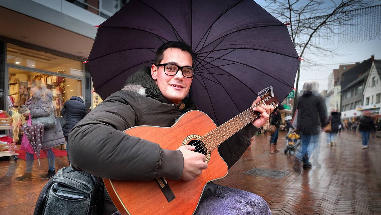 Gütersloh. Auch an diesem windig-trüben Mittag um kurz nach 13 Uhr hat Simon Titz mitten in der Fußgängerzone wieder seinen Bühnenplatz eingenommen. Es regnet, es ist kalt, die meisten Passanten sind in Eile, natürlich, das furchtbare Wetter lässt sie hektisch werden. Simon Titz lächelt, so macht er es immer, wenn er ein Lied anstimmt, und dann beginnt er, geschützt durch einen großen Schirm in seinem Rollstuhl sitzend, auf seiner Gitarre zu spielen. Er möchte den Menschen mit seinen Liedern eine Freude machen, sagt er. Und ja, vielleicht auch berühmt werden.