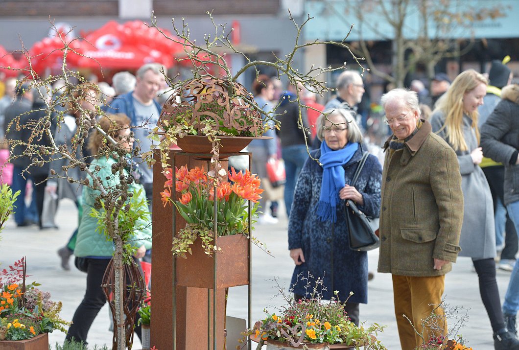 Und egal wo man hinsah - bei zwölf Grad Außentemperatur strahlten Besucher, Gartenfreunde, grüne Branche und Geschäftsinhaber mit der wärmenden Frühjahrssonne um die Wette. Spaßvögel waren angesichts der überall deutlich spürbaren Einkaufslust sogar geneigt, das von Gütersloh Marketing (gtm) kreierte einladende Wortspiel "Gütersloh blüht auf" in "Gütersloh im Shoppingrausch" oder "Geld ausgeben - Juch-He" abzuändern. Egal ob auf der Königstraße, Berliner Platz, Berliner Straße oder Kolbeplatz, das Blütenmeer machte einfach Lust auf mehr.