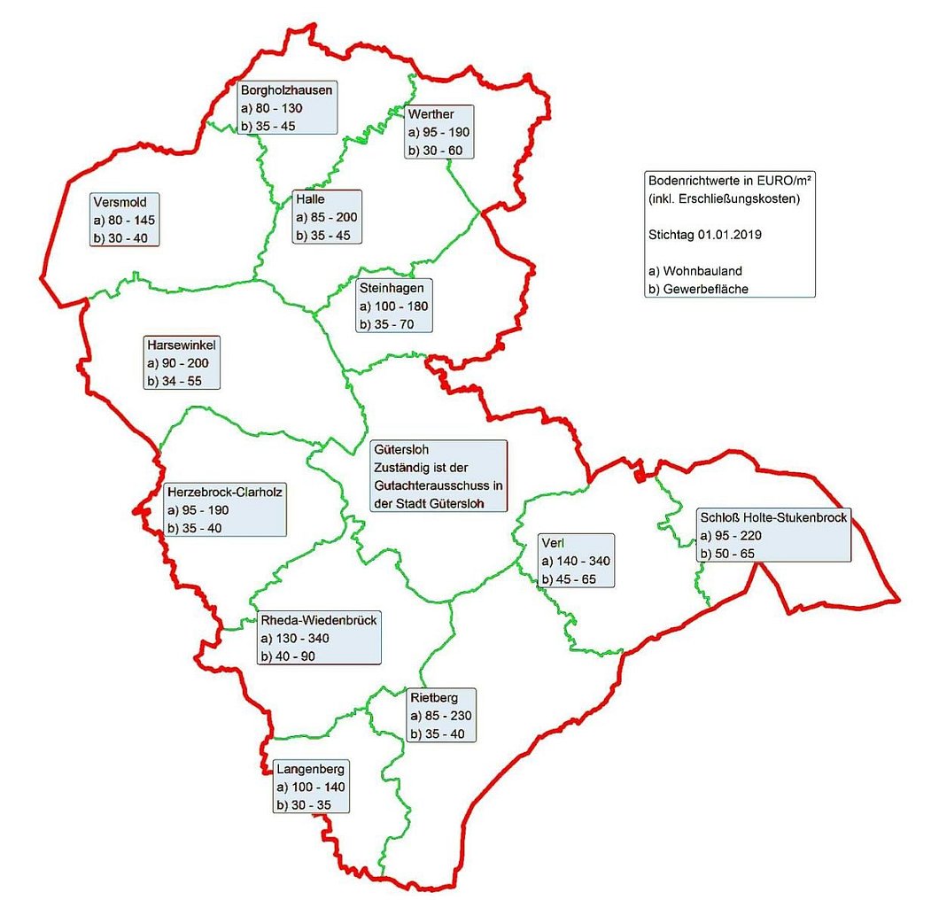Das Preisniveau für Wohnbauland ergibt sich in den einzelnen Orten sehr unterschiedlich. Die günstigsten Baulandflächen liegen in Borgholzhausen und Langenberg. Die teuersten Lagen befinden sich in Verl und Rheda-Wiedenbrück. Auch in den übrigen Teilmärkten wie Gewerbebauland oder landwirtschaftlich genutzten Flächen sind Preissteigerungen festgestellt worden. Lediglich das Preisniveau von forstwirtschaftlich genutzten Flächen weist ein konstantes Niveau auf.