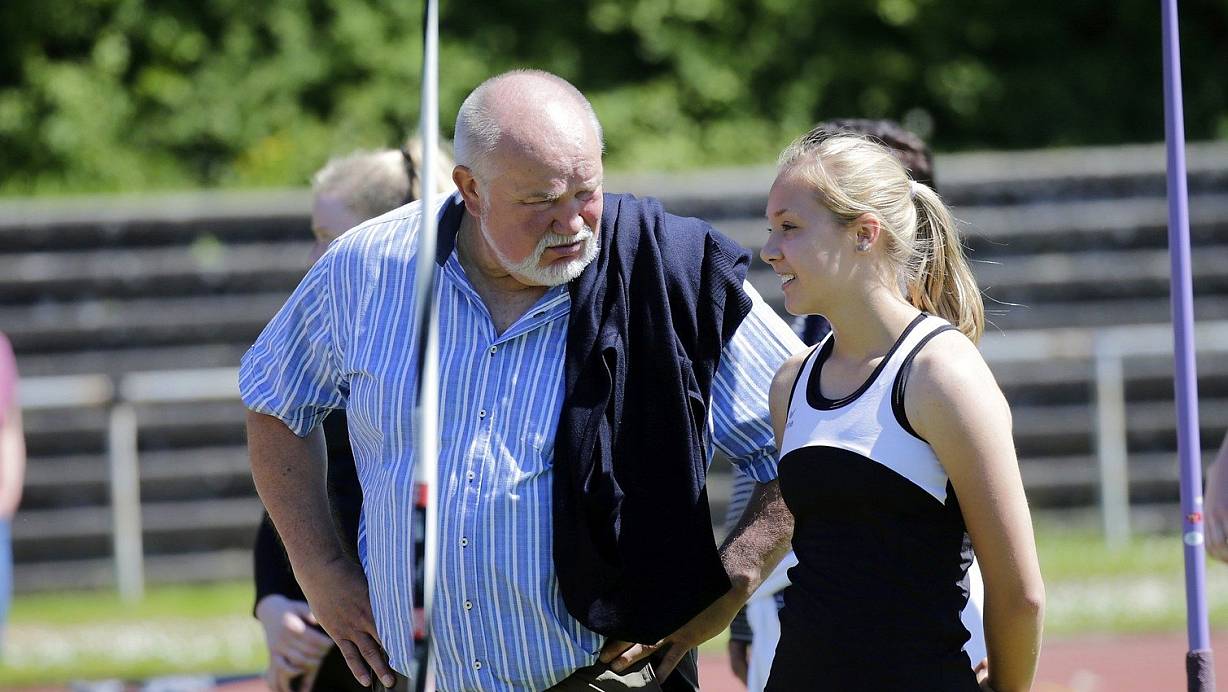 Michael Wessing mit Kim Scharpenberg bei den Leichtathletik-Kreismeisterschaften im vergangenen Jahr in Gütersloh. | © Henrik Martinschledde
