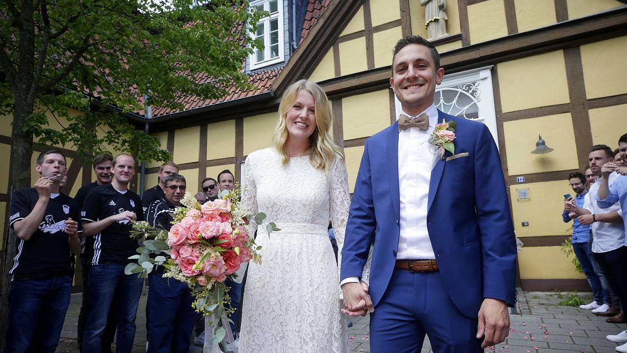 Ehepaar: Siebenkämpferin Lisa Schlüter und ihr frisch angetrauter Gatte Patrick wurden vor dem Rietberger Standesamt von zahlreichen Freunden und den Fußballern der Druffeler SG empfangen. | © Henrik Martinschledde