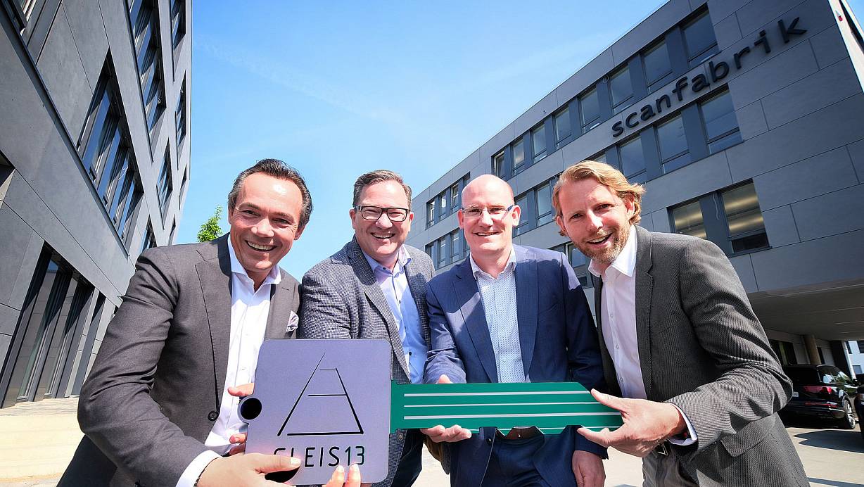 Schon wieder einen Schlüssel übergeben: Gleis 13-Gesellschafter Thomas Hagedorn (l.) und Architekt Tim Dressler (r.) freuen sich über die Mieter Erich Schemmann (2.v.l.) und Andreas Poppenborg. | © Andreas Frücht