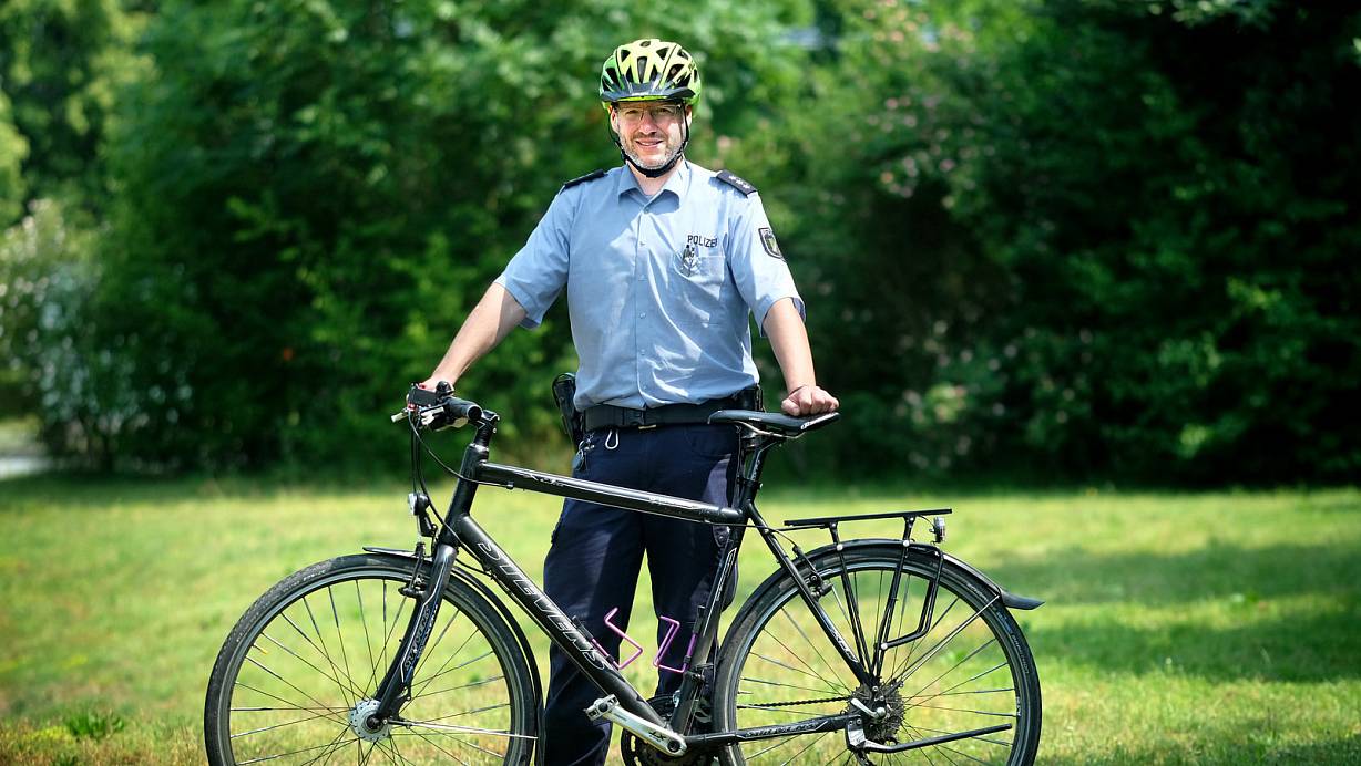 Polizeihauptkommissar Sebastian Brand zeigt, wie ein korrekt ausgestattetes Fahrrad aussehen muss. | © Andreas Frücht
