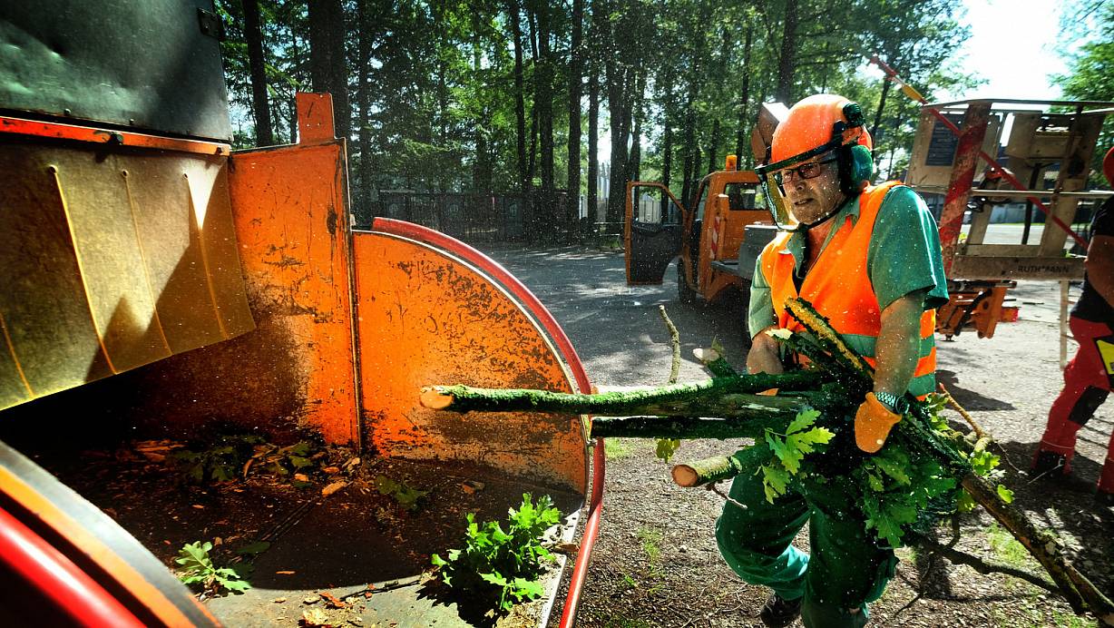 Ralf Wehmeier schleppt Astwerk in den Häcksler. | © Andreas Frücht