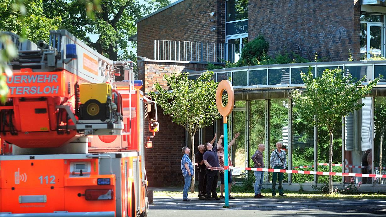 Feuerwehr und städtische Baumexperten kontrollieren die Bäume an der Janusz-Korczak-Gesamtschule in Gütersloh auf der Suche nach dem gefährlichen Eichenprozessionsspinner.