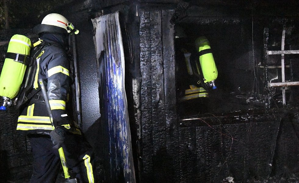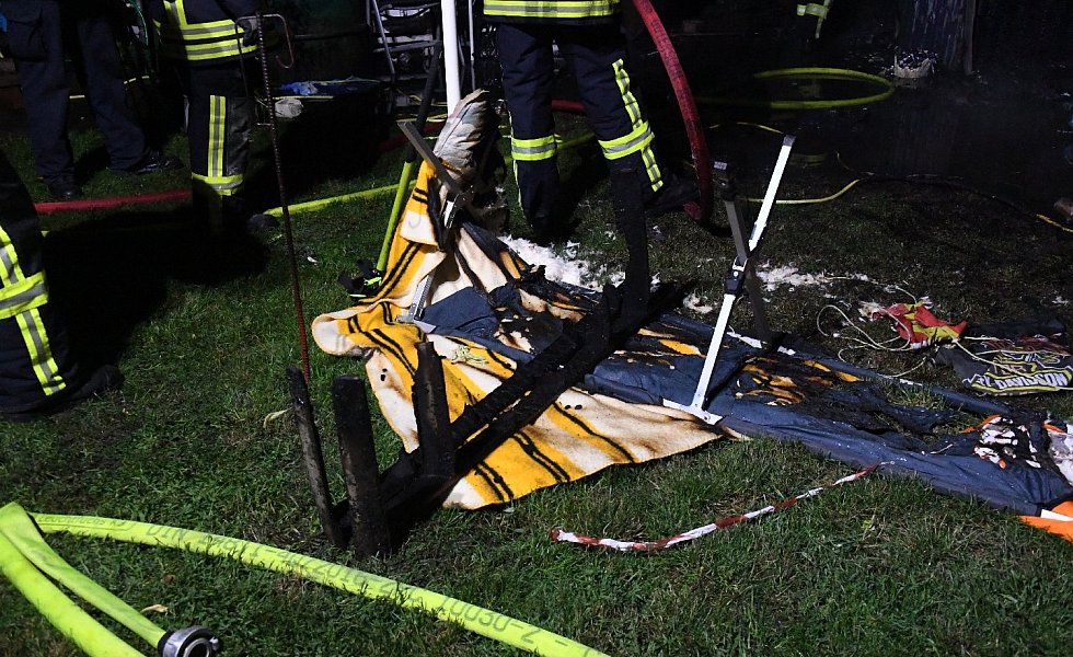 Ermittlungen zur Brandursache ergaben, dass der 38-jährige Besitzer mittels Benzin die glimmenden Holzscheite in einer Feuertonne stärker zum Brennen bringen wollte. Hierbei sprang das Feuer auf den Benzinkanister über, den er sofort zur Seite warf. Das Feuer des brennenden Kanisters entzündete schließlich die Gartenlaube. Der Besitzer und drei weitere anwesende Personen konnten sich in Sicherheit bringen und blieben unverletzt.