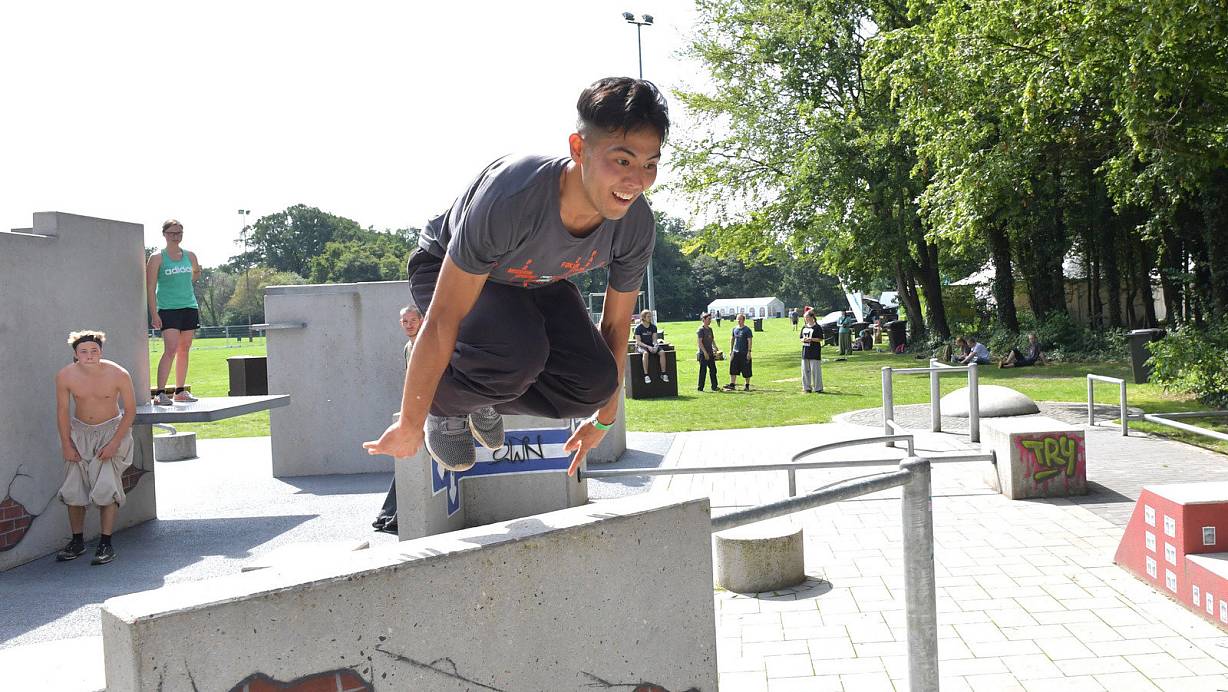 Wie zum Beweis seiner Begeisterung nahm er zwei, drei Schritte Anlauf, sprang ab, katapultierte seinen Körper leichtfüßig in die Höhe, um mit einem weiten Satz drei Meter weiter mit sicherem Stand auf der nächsten Absprungbasis zu landen. Dem offiziellen Parkour-Camp-Initiator Claus-Peter "Pit" Mosner vom Fachbereich Jugend und Bildung der Stadt nebst seiner gut 50-köpfigen Helferschar gingen diese Worte runter wie Öl.