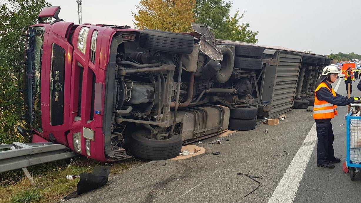Der Zusammenprall zwischen dem Lastwagen und dem Sportwagen wird durch einen geplatzten Reifen verursacht.