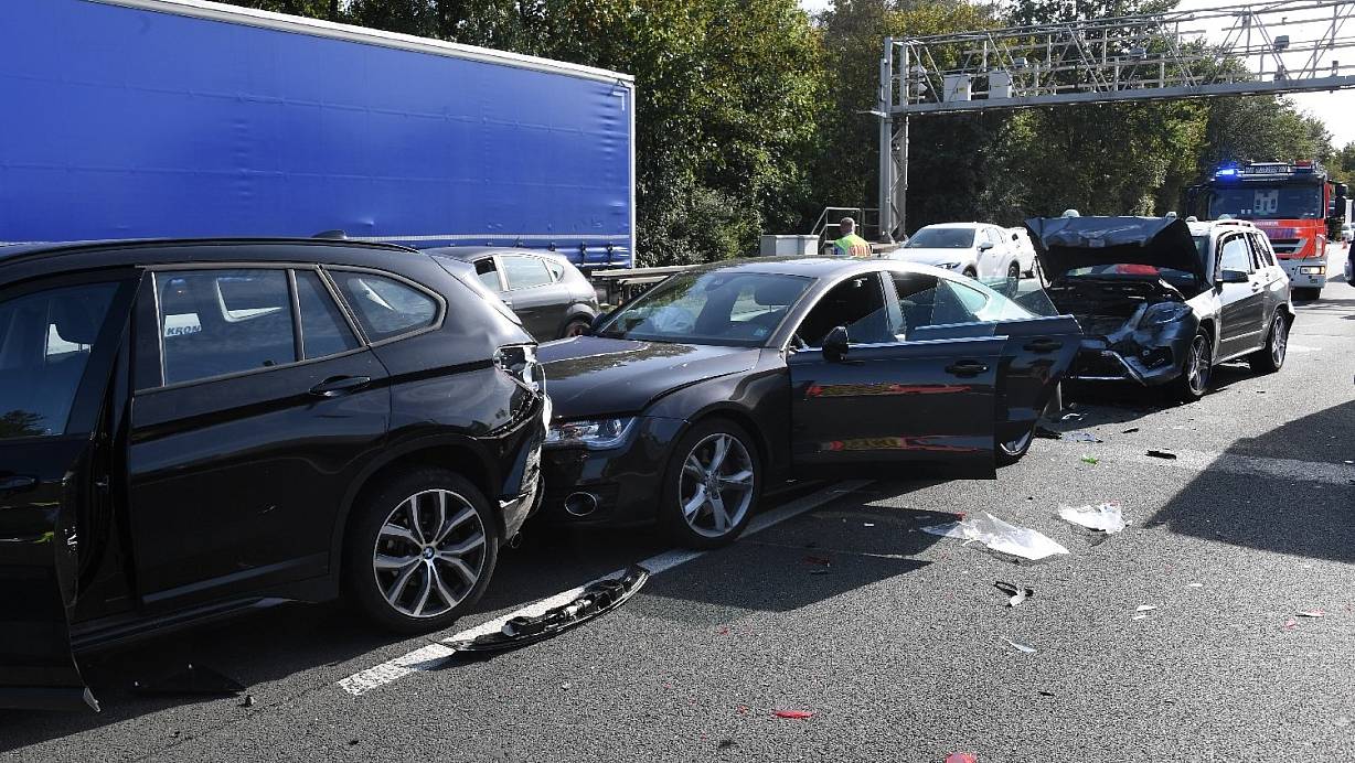 Der Audi wurde dann noch auf den BMW X1 geschoben, an den Fahrzeugen entstand jeweils Totalschaden. Der wird von der Polizei auf etwa 80.000 Euro geschätzt, während der Unfallaufnahme wurden der linke und mittlere Fahrstreifen gesperrt. Die Blechlawine staute sich auf einer Länge von neun Kilometern.