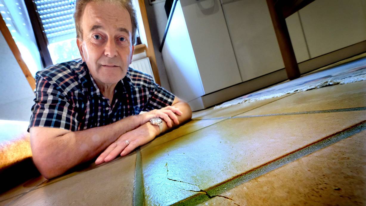 Schwere Schäden: Durch die heftigen Erschütterungen der Abrissarbeiten sind im Haus von Harald Behr einige Risse, wie hier im Fliesenboden der Küche, entstanden. | © Andreas Frücht