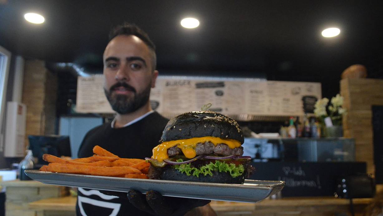 Faulus Celik mit dem außergewöhnlichen schwarzen Burger. | © Alexander Lange