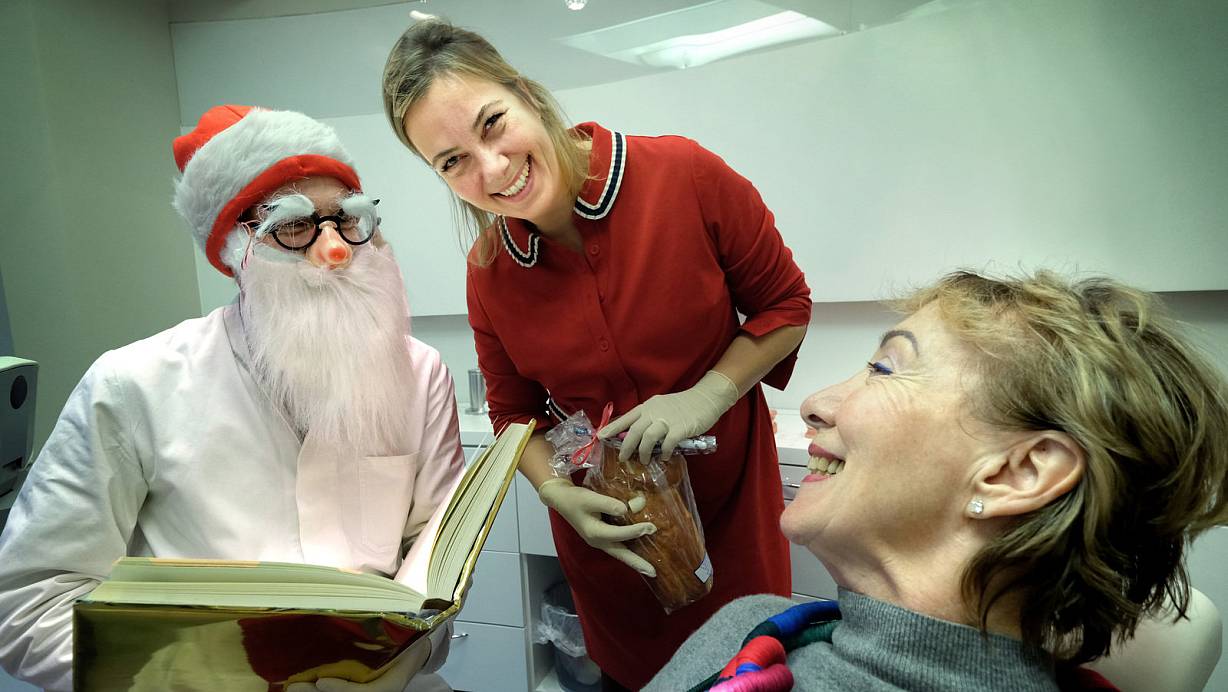 "Das hat inzwischen Tradition. Seit 20 Jahren mache ich das schon und das Ganze kommt bei den Patienten gut an", erzählt gut gelaunt Dr. Christian Kube, der die Praxis in Gütersloh seit 1996 betreibt. Einige Patienten würden schon extra nach einem Termin am Nikolaustag fragen, um von ihm und seiner Frau im weihnachtlichen Kostüm empfangen zu werden. "So wollen wir den Kindern auch die Angst vor Arztbesuch nehmen", sagt Dr. Mareen Knop.Und bevor die Praxis am 6. Dezember öffnet, bekommen auch die Mitarbeiter einen versüßten Start in den Arbeitstag. Aus seinem großen goldenen Buch liest der Chef vor und verteilt neben Gebäck viel Lob.