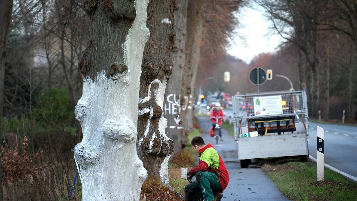 Weiß: Der Mitarbeiter der Straßenmeisterei streicht eine Kalk-Mineral-Mischung über die Stämme. | © Andreas Frücht