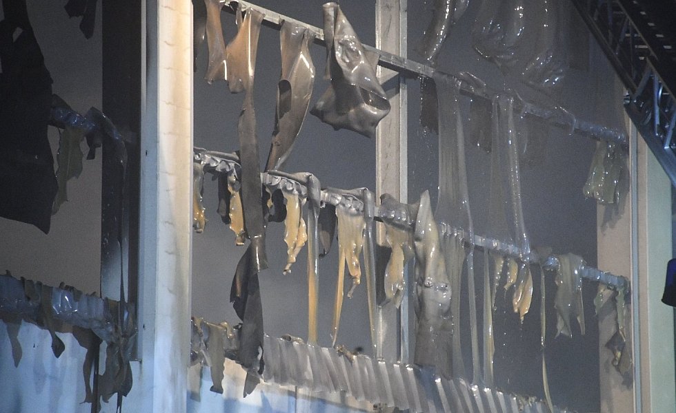 „Wir decken das nun etwa auf Kniehöhe zusammengeschmolzene Styropor mit einem Schwerschaumteppich ab", berichtete Koch zu diesem Zeitpunkt das weitere Vorgehen. Zuvor war bereits ein Feuerwehrmann mit einem Radlader in die Halle gefahren.